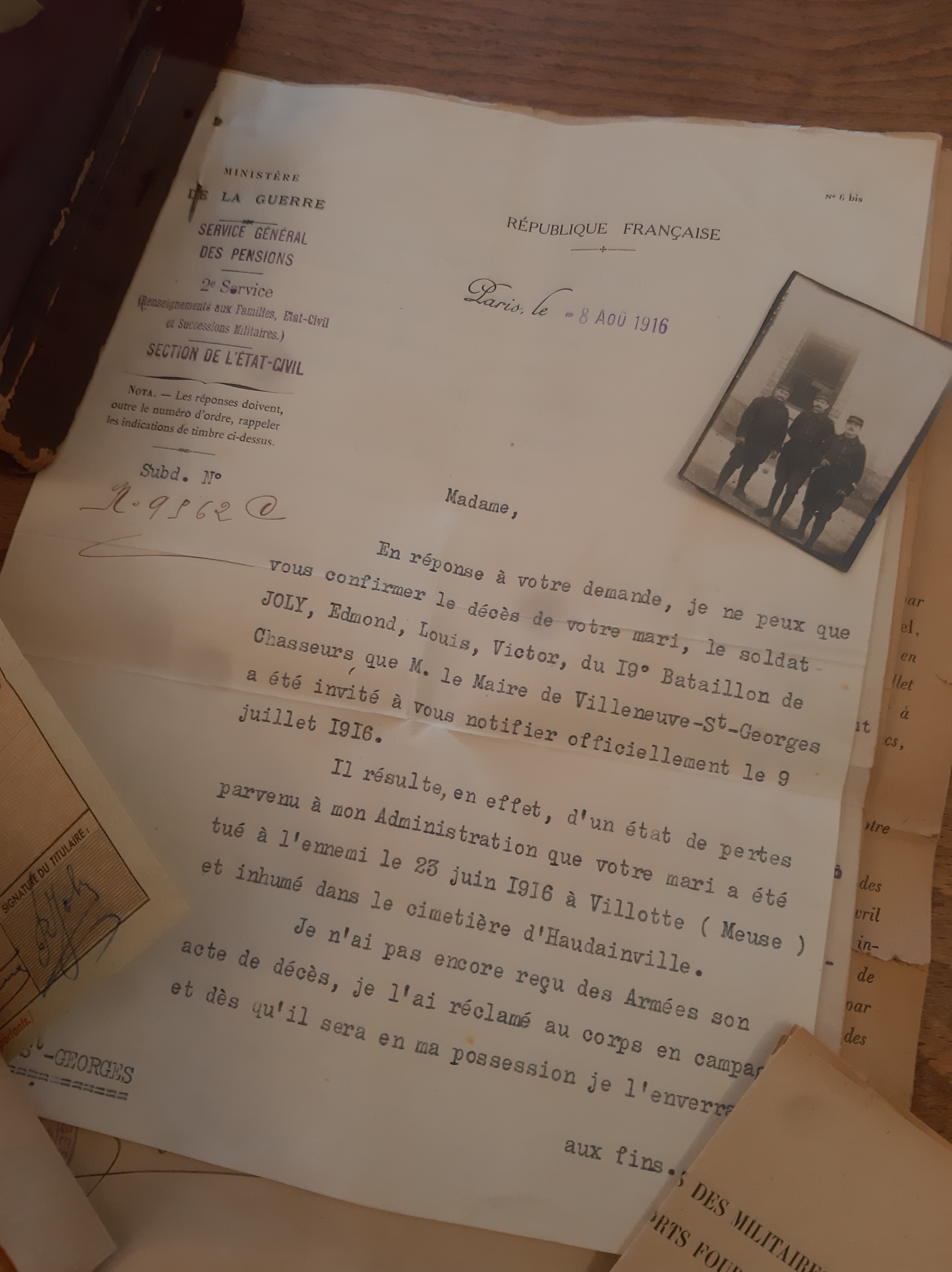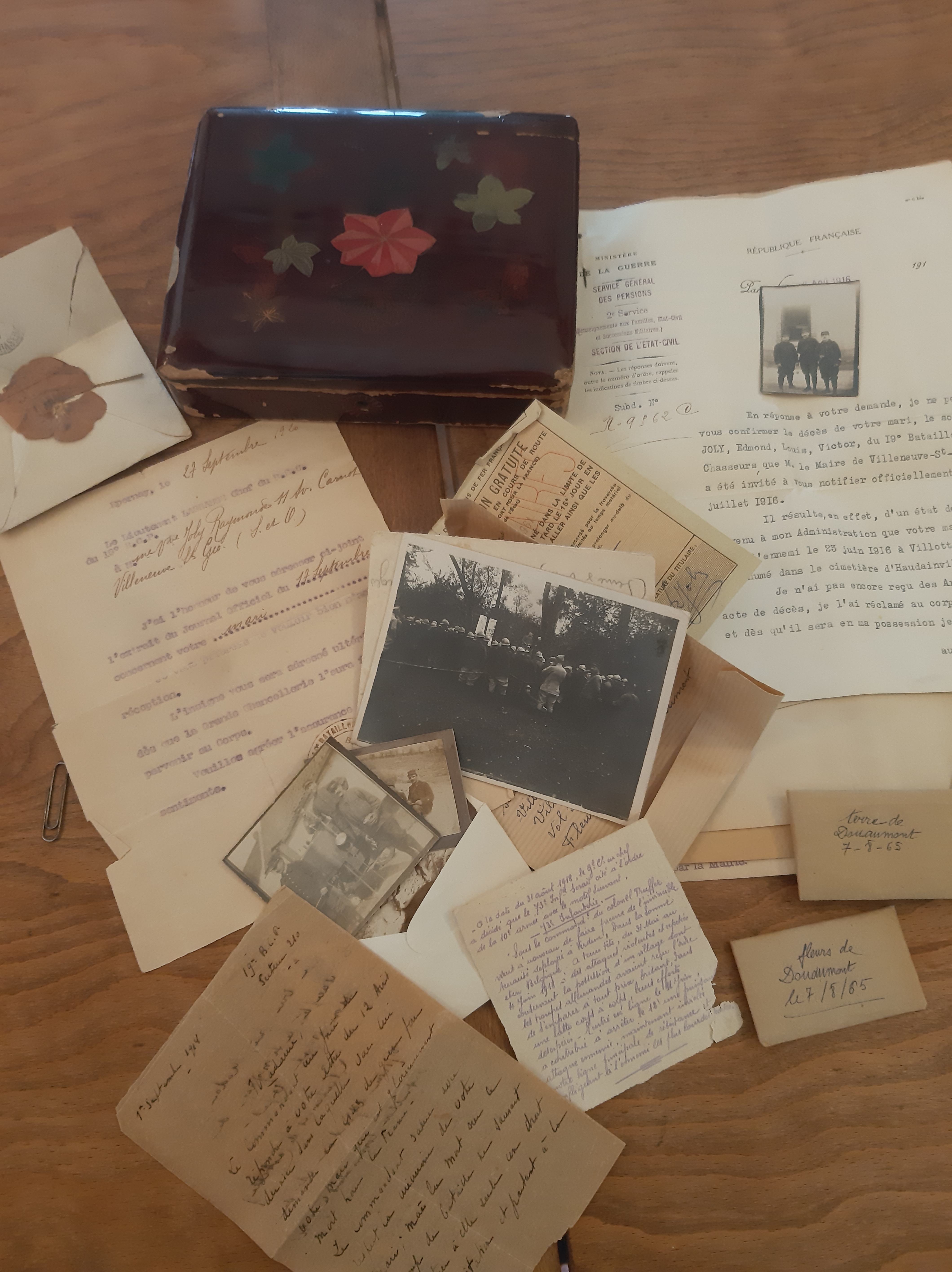 Un papa mort à la Guerre. C’est à Argelès-Gazost que j’ai trouvé cette modeste boîte japonaise, véritable petit reliquaire contenant tout un assortiment de lettres officielles, de lettres personnelles, de photographies, de terre et de fleurs séchées prélevées sur les champs de batailles, consacrés à la disparition en 1916, en pleine bataille de Verdun, non loin du fort de Douaumont, d’un certain Edmond Joly. Cette petite boîte était encore dans la maison de sa fille, qui n’a quasiment pas connu son père. Ils étaient tellement nombreux ceux qui sont tombés, sans sépultures connues, et dont le souvenir a accompagné leurs familles tout au long du XXe siècle.