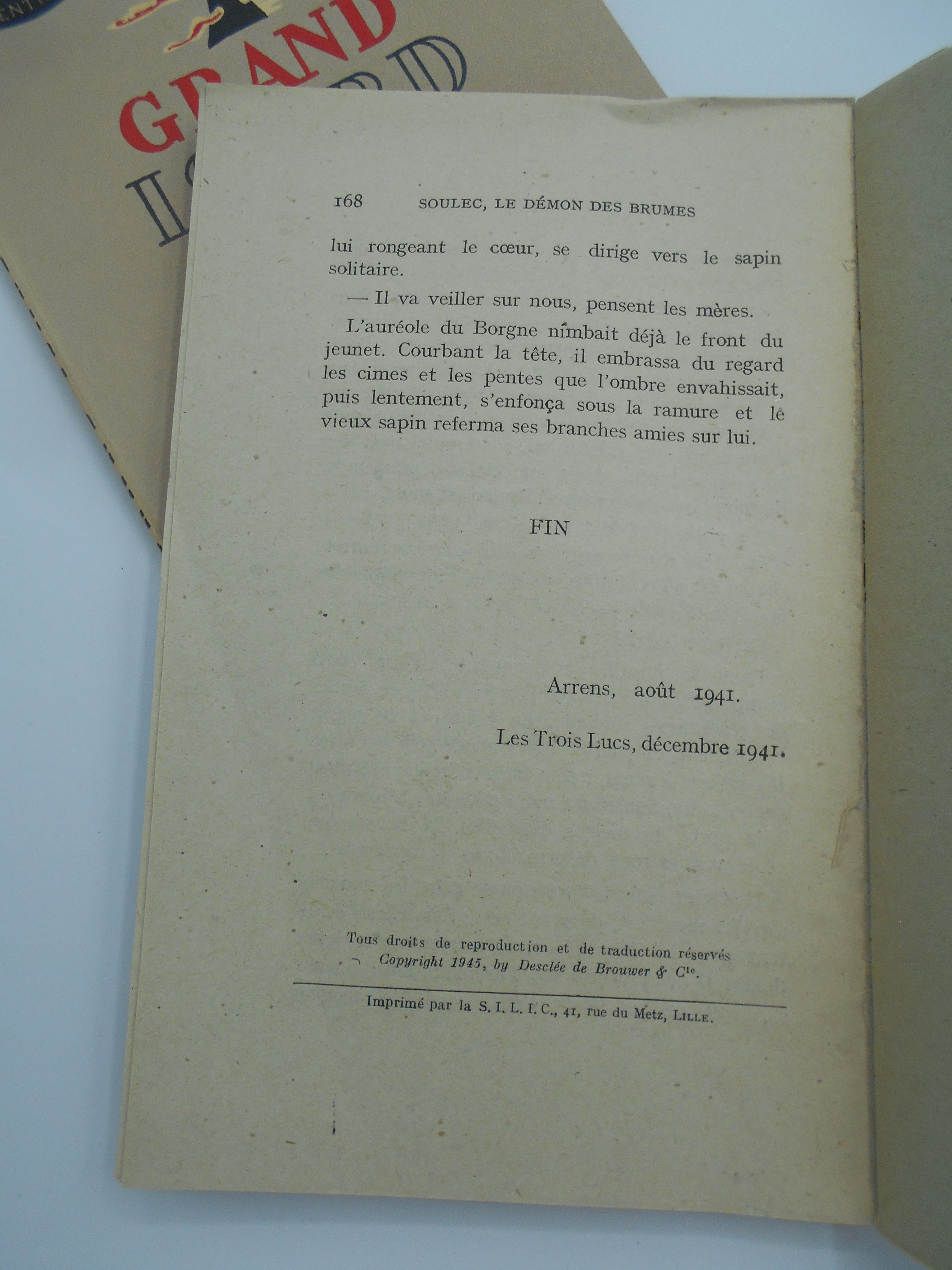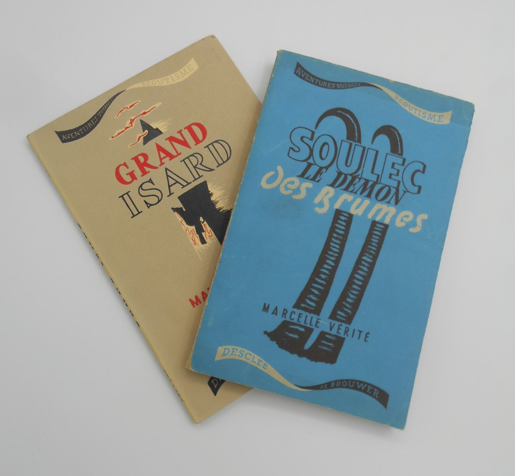 Marcelle Vérité (1904-1994) eut ses heures de gloire comme auteure pour la jeunesse, tant et si bien que nous croisons régulièrement ses œuvres dans les bibliothèques constituées des années 1930 aux années 1980. Originaire du Béarn, nous avions connaissance de ses liens amicaux avec la famille des hôteliers Meillon de Pau et Cauterets, mais quelle ne fut pas notre surprise de lui découvrir deux romans « pyrénéens », mettant en scène la faune de ces mêmes montagnes, et dont le premier a été écrit à Arrens en 1941! Publié en 1945, Soulec, le Démon des Brumes (quel titre!), met en scène une compagnie d’isards, menée par un mâle géant, farouche et borgne, le fameux démon des Brumes, et que traque un berger très braconnier sur les bords revenu d’Amérique pour reprendre l’exploitation familiale. L’ouvrage connut une suite, « Grand Isard » (1946), où celui-ci reprend la tête de la harde au milieu de tout un bestiaire amical constitué de lynx, loups, écureuils, etc. C’est charmant, frais et très bien documenté sur la vie en montagne dans les Pyrénées centrales. Et en plus, c’est beau, les visuels sont très réussis, notamment la couverture de Grand Isard qui est sérigraphié. Que d’aventures en Val d’Azun!