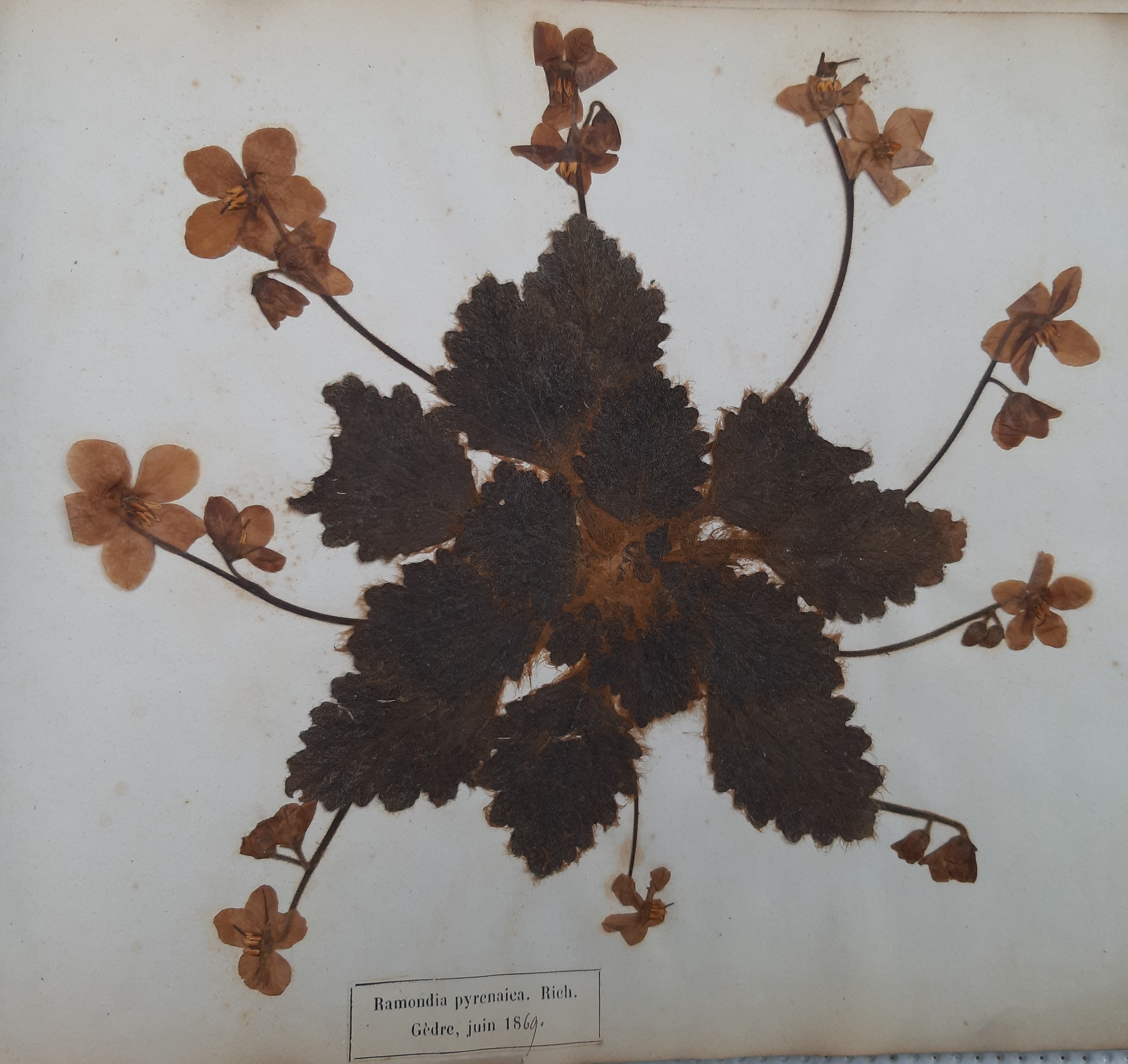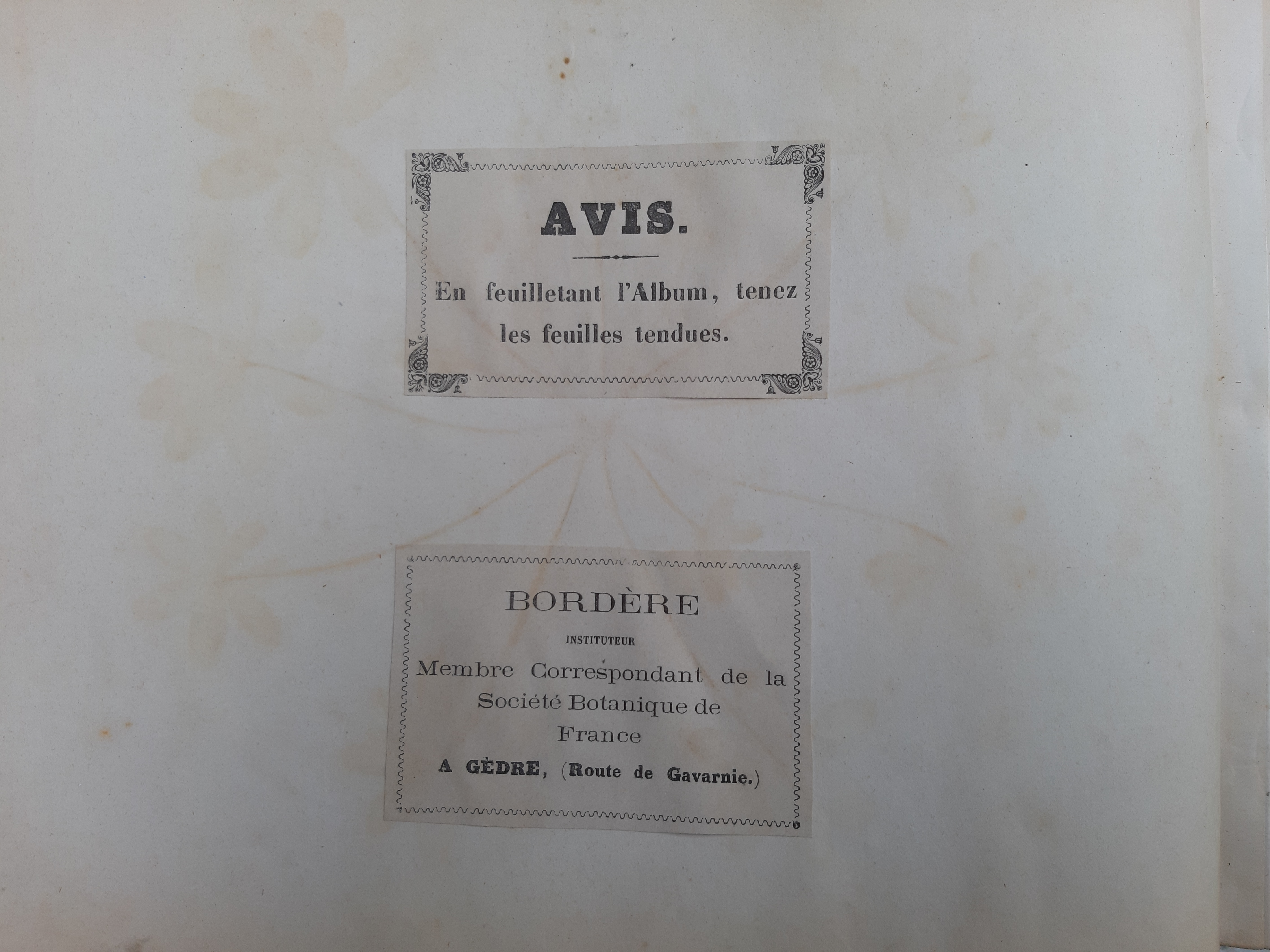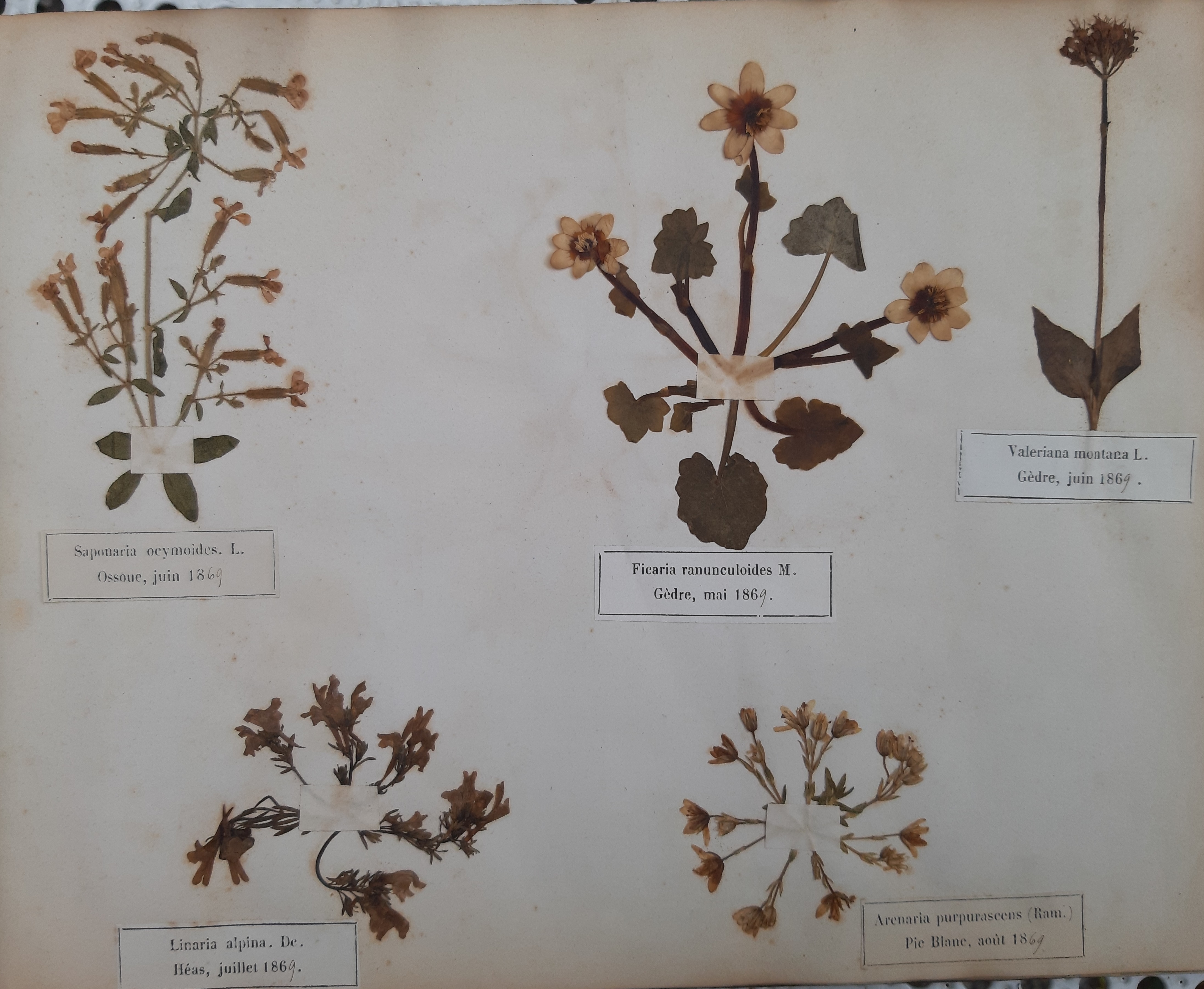 Quel plaisir que de faire l’acquisition d’un herbier de Henri Bordère, instituteur à Gerde (†1889) qui botanisait autour de Gavarnie et composait ces herbiers qu’il vendait aux touristes de passage dans sa commune. Les 97 spécimens sont datés de l’année 1869, ce qui place cet exemplaire dans la toute première génération de ces très beaux herbiers, composés avec beaucoup de soin et avec certains spécimens rares telle la Ramondia pyrenaica. Je vous laisse apprécier la beauté de l’objet.