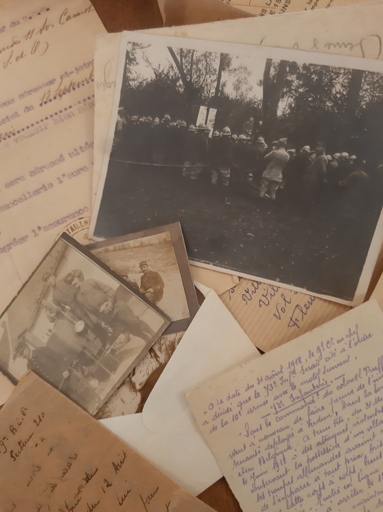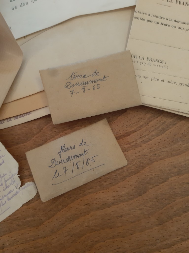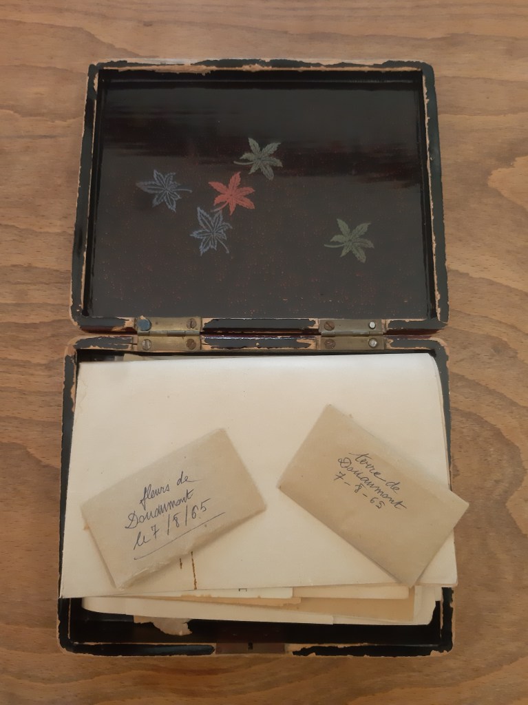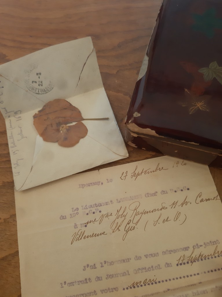 Un papa mort à la Guerre. C’est à Argelès-Gazost que j’ai trouvé cette modeste boîte japonaise, véritable petit reliquaire contenant tout un assortiment de lettres officielles, de lettres personnelles, de photographies, de terre et de fleurs séchées prélevées sur les champs de batailles, consacrés à la disparition en 1916, en pleine bataille de Verdun, non loin du fort de Douaumont, d’un certain Edmond Joly. Cette petite boîte était encore dans la maison de sa fille, qui n’a quasiment pas connu son père. Ils étaient tellement nombreux ceux qui sont tombés, sans sépultures connues, et dont le souvenir a accompagné leurs familles tout au long du XXe siècle.